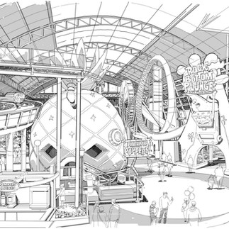 From whimsical programmatic icons like the gift-box Children’s Mall, to intricate heritage restorations, grand palatial hotel ensembles, and immersive coastal masterplans, his pieces embody both precision and wonder. Working primarily in pen-and-ink, accented by selective color concept renders, Ar. Eugene crafts illustrations that read as story, memory, and proposition all at once.