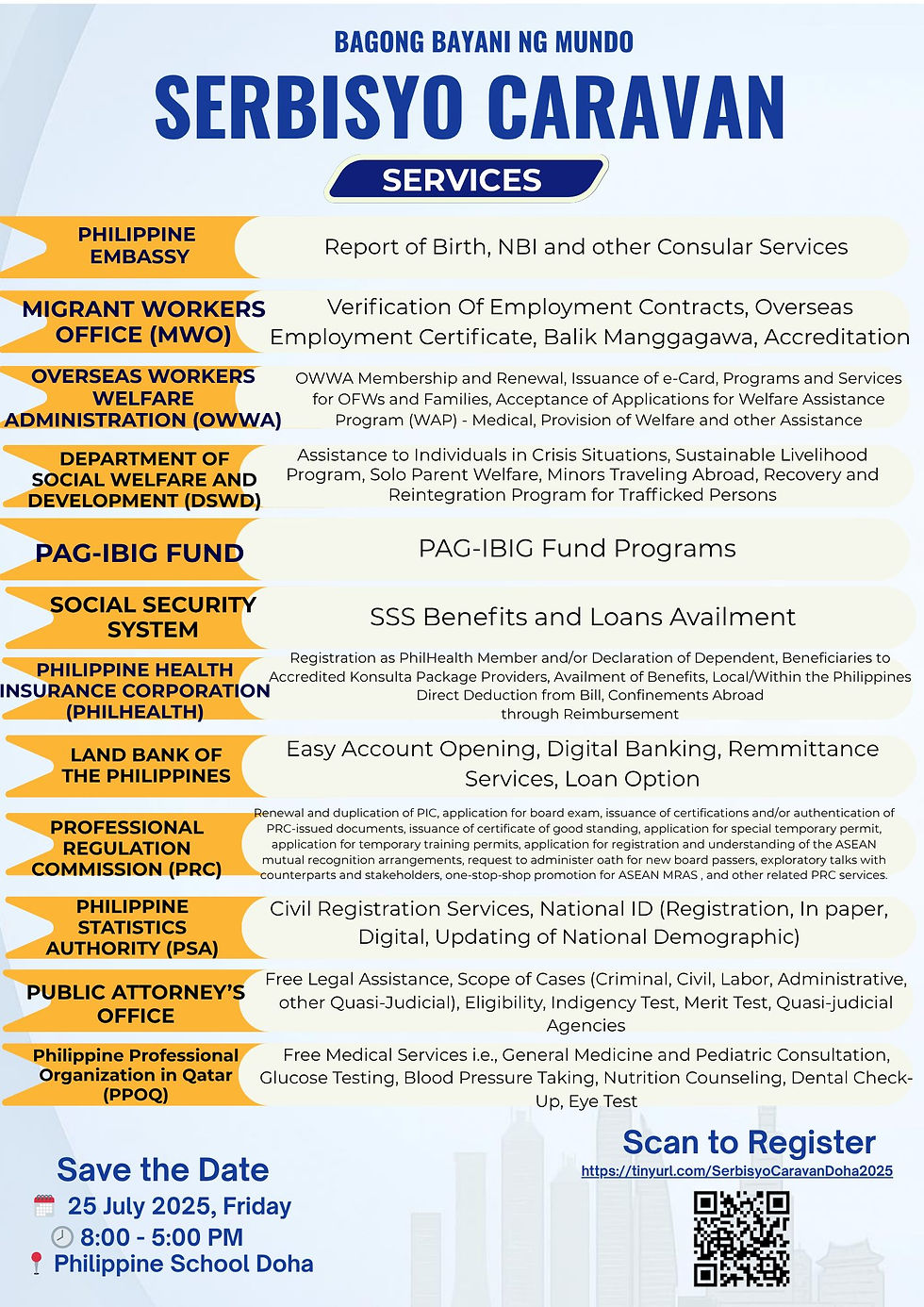 Filipinos in Qatar are encouraged to be part of this meaningful gathering of services, culture, and community. Registration is now open via the provided QR code or through this link: https://tinyurl.com/SerbisyoCaravanDoha2025.